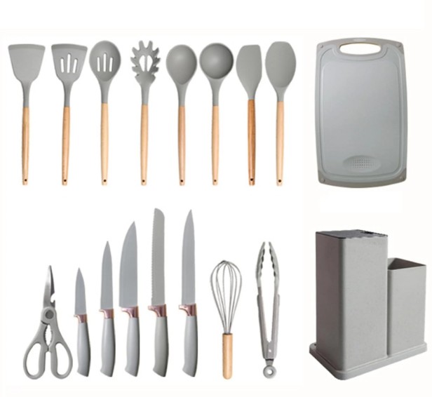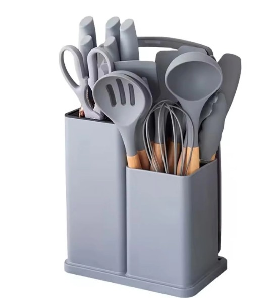Soporte Organizador: El set incluye un soporte que mantiene todos los utensilios organizados y fácilmente accesibles, además de agregar un toque de elegancia a tu cocina.